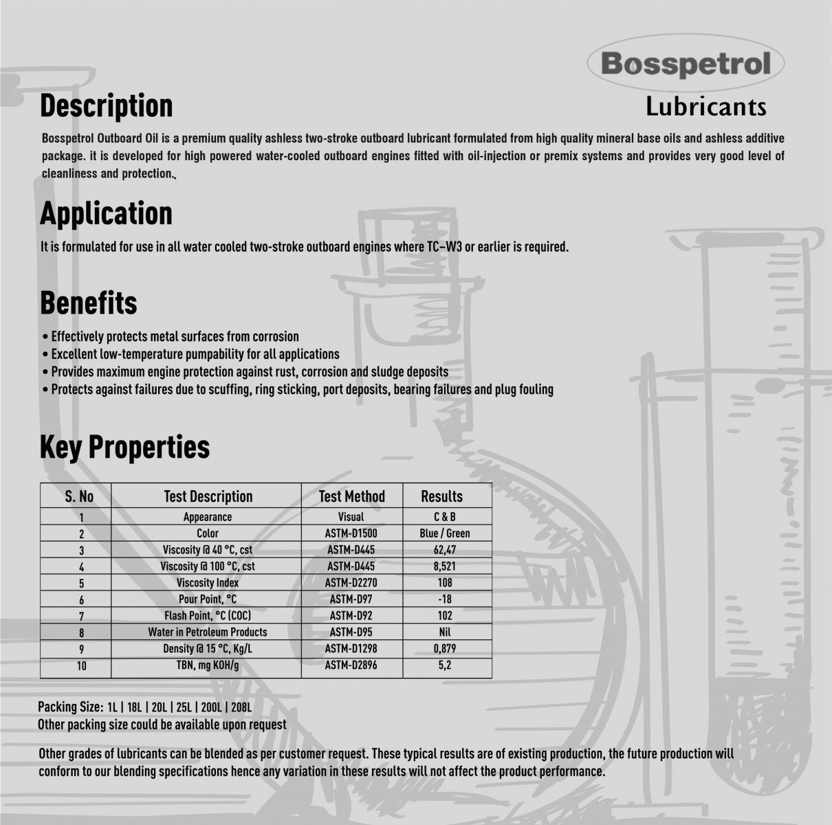 Các loại chất bôi trơn khác có thể được pha trộn theo yêu cầu của khách hàng. Những kết quả điển hình này là của các sản phẩm hiện có, các sản phẩm trong tương lai sẽ tuân thủ các thông số kỹ thuật pha trộn của chúng tôi do đó mọi thay đổi trong các kết quả này sẽ không ảnh hưởng đến hiệu suất sản phẩm.